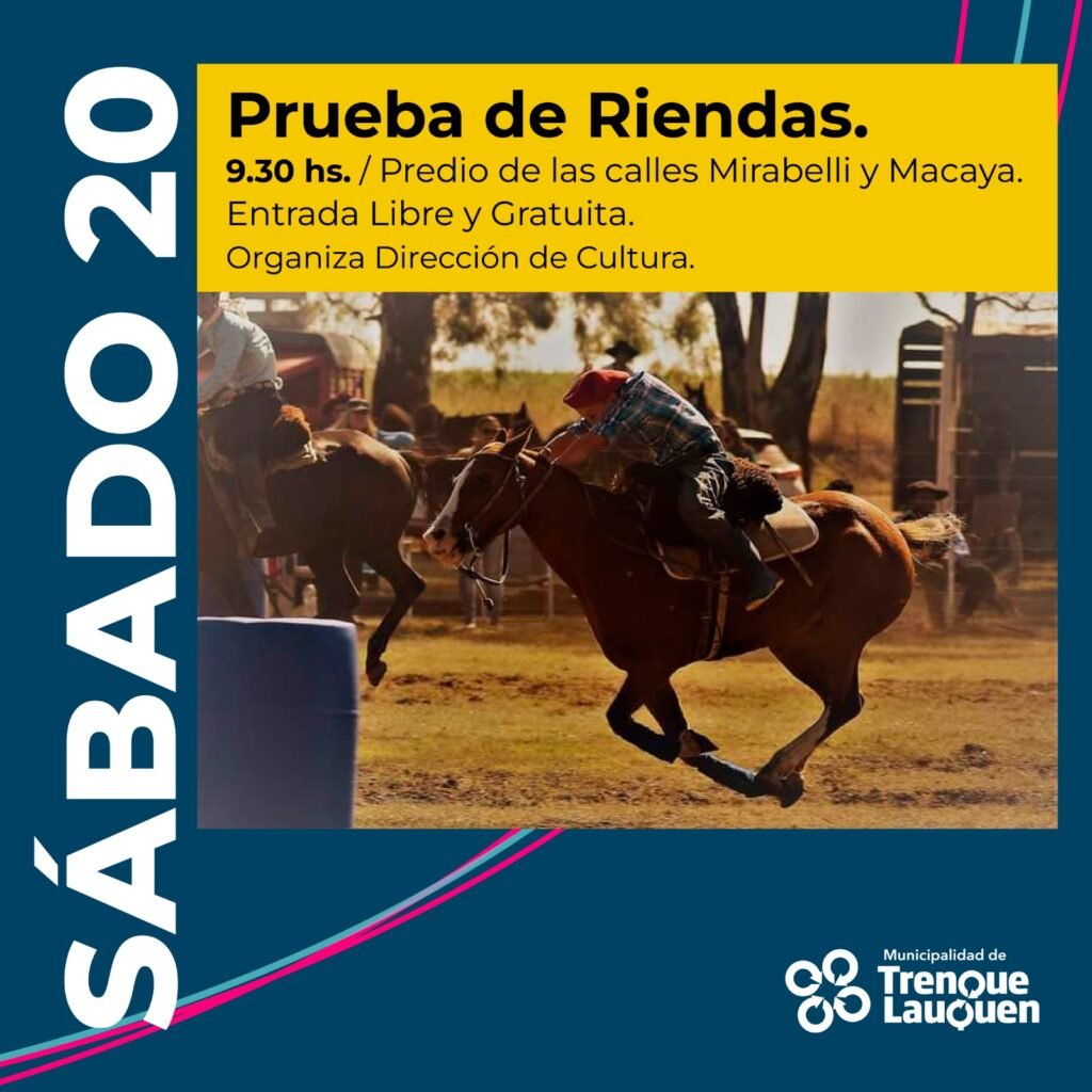 La Prueba de Riendas se realizará el domingo en el predio de Mirabelli y Macaya, y comenzará a las 9.30 con el izamiento de la Bandera Nacional. A continuación, se desarrollarán las distintas pruebas, en una intensa jornada que contará con la animación de Gerardo Suárez.