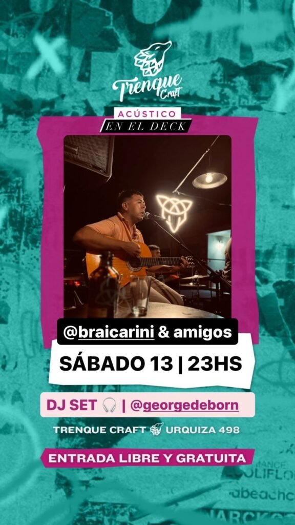 Este sábado 13 de enero a las 22hs se presenta Brai Carini junto a amigos en ciclo Acústico en el Deck de Trenque Craft.
