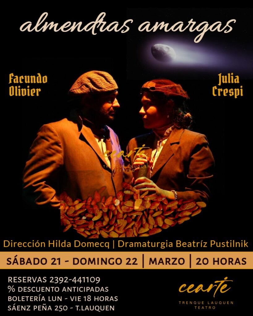 Este fin de semana vuelve “Almendras Amargas” a la sala del Cearte. La obra de la dramaturga Beatriz Pustilnik, protagonizada por Juli Crespi y Facu Olivier, con la dirección de Hilda Domecq, se presentará este sábado y domingo a las 20 hs en Sáenz Peña 250, luego de su exitoso estreno el pasado fin de semana.