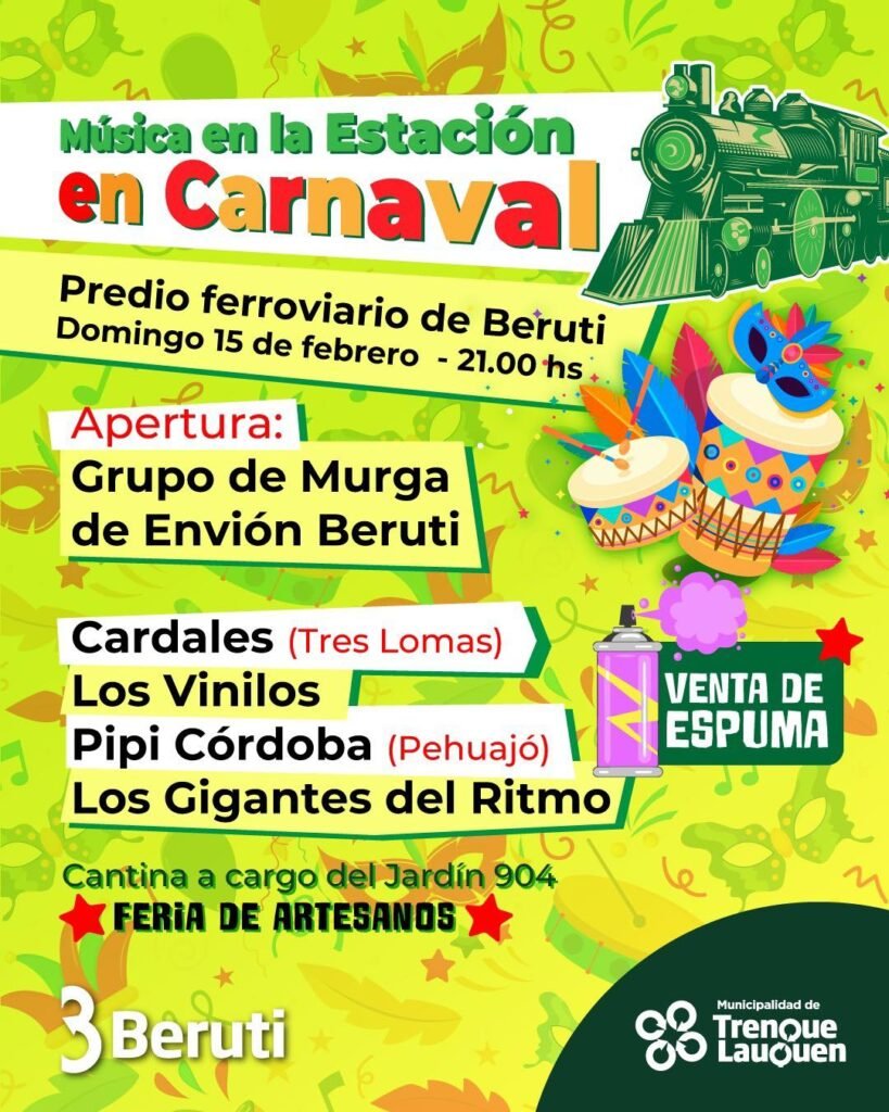El domingo 15 de febrero, a partir de las 21, el predio ferroviario de Beruti será escenario de una nueva propuesta cultural con la realización de Música en la Estación y Baile de Carnaval, una jornada organizada por la Dirección de Cultura en el marco del ciclo Música de Verano, con el apoyo de la Delegación municipal.