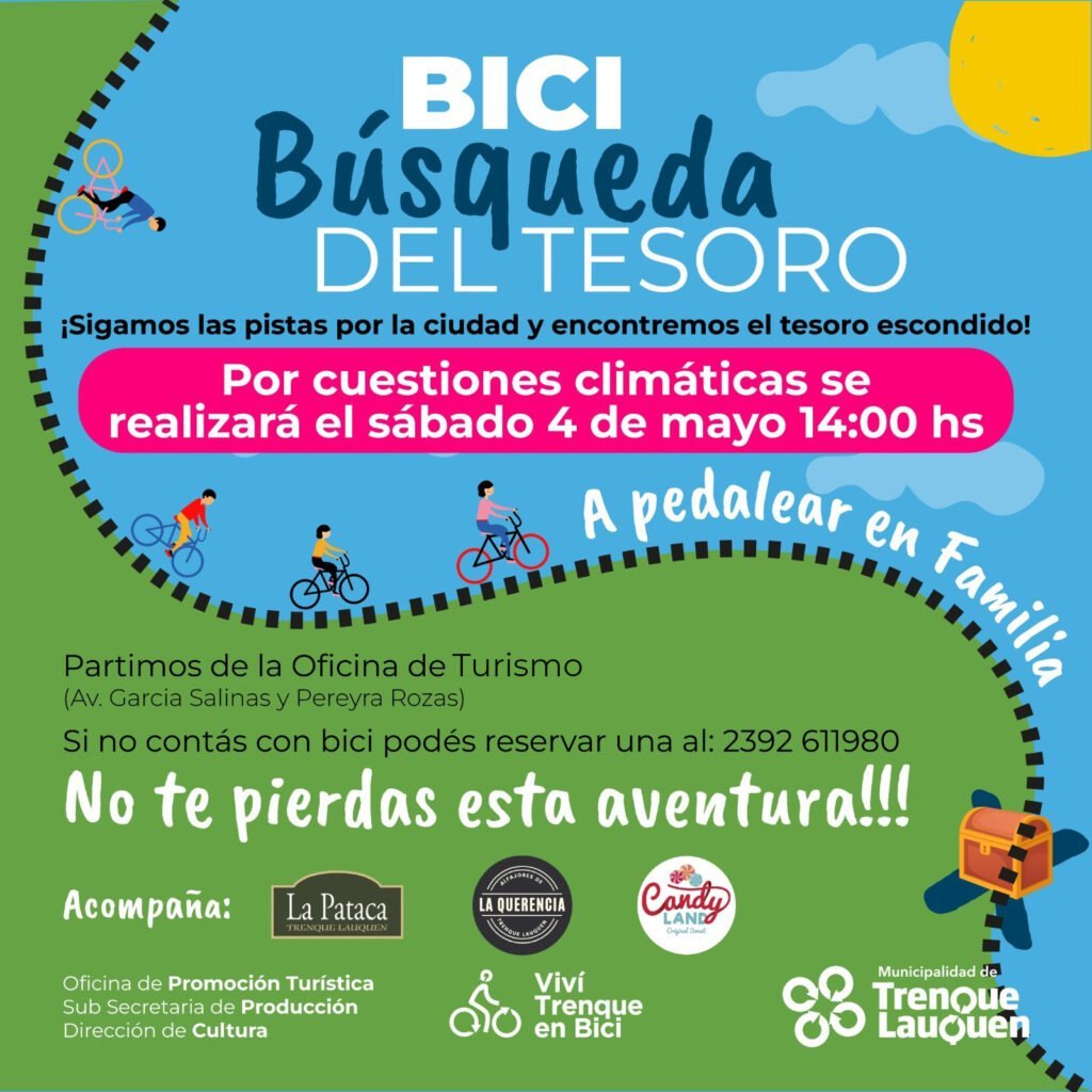 La “Bici Búsqueda del Tesoro”, que organiza la oficina de Promoción Turística del Municipio, se adelantó para mañana (sábado) debido a los pronósticos de lluvia y mal tiempo para el domingo (5), en el que iba a realizarse la actividad que está pensada para compartir y disfrutar en familia.