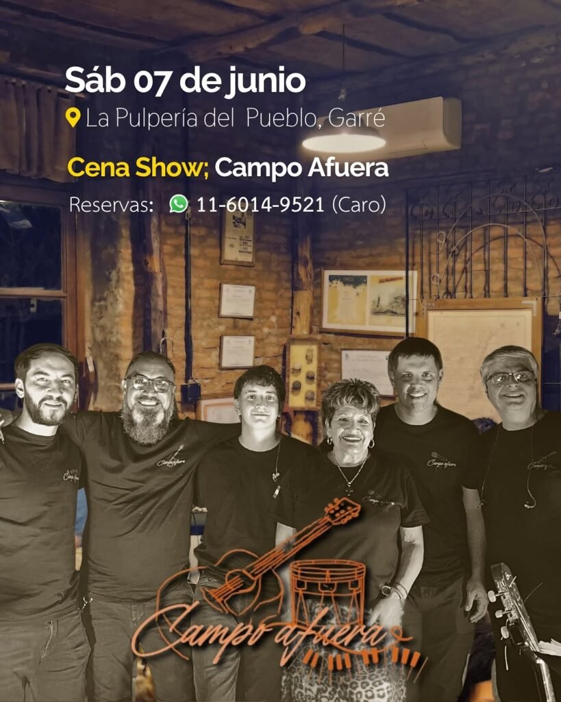 Este sábado 7 de junio desde las 21 hs. en La Pulpería del Pueblo, de Garré, habrá Cena Show, con la presentación de Campo Afuera, un grupo oriundo de Tres Lomas, con una propuesta de folklore tradicional y popular.