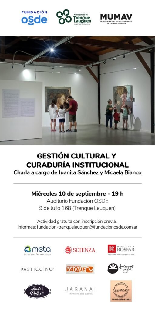 El miércoles 10 de septiembre a las 19 hs. en el Auditorio de la Fundación OSDE (9 de julio 168) se llevará a cabo una charla sobre Gestión cultural y Curaduría institucional, que estará a cargo de Juanita Sánchez y Micaela Bianco.