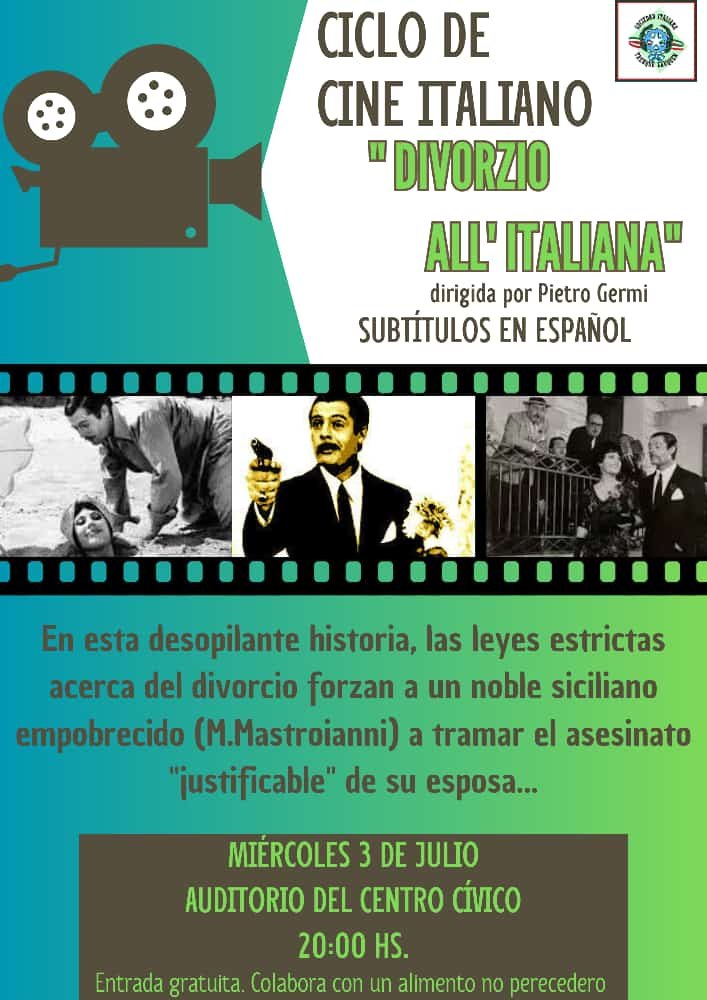 En esta oportunidad, desde las 20 hs se proyectará Divorzio all’italiana, una película del año 1961, dirigida por Pietro Germi, protagonizada por Marcello Mastroiani.