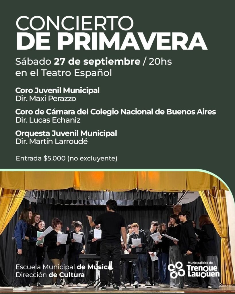Este sábado 27 de septiembre desde las 20 hs. en el Teatro Español tendrá lugar el Concierto de Primavera, que contará con la participación del Coro Juvenil de la Escuela Municipal de Música de Trenque Lauquen, que dirige Maximiliano Perazzo, la Orquesta Juvenil de la Escuela de Música, que dirige Martín Larroudé, y como invitados especiales el Coro de Cámara del Colegio Nacional Buenos Aires, que dirige el trenquelauquense Lucas Echaniz.