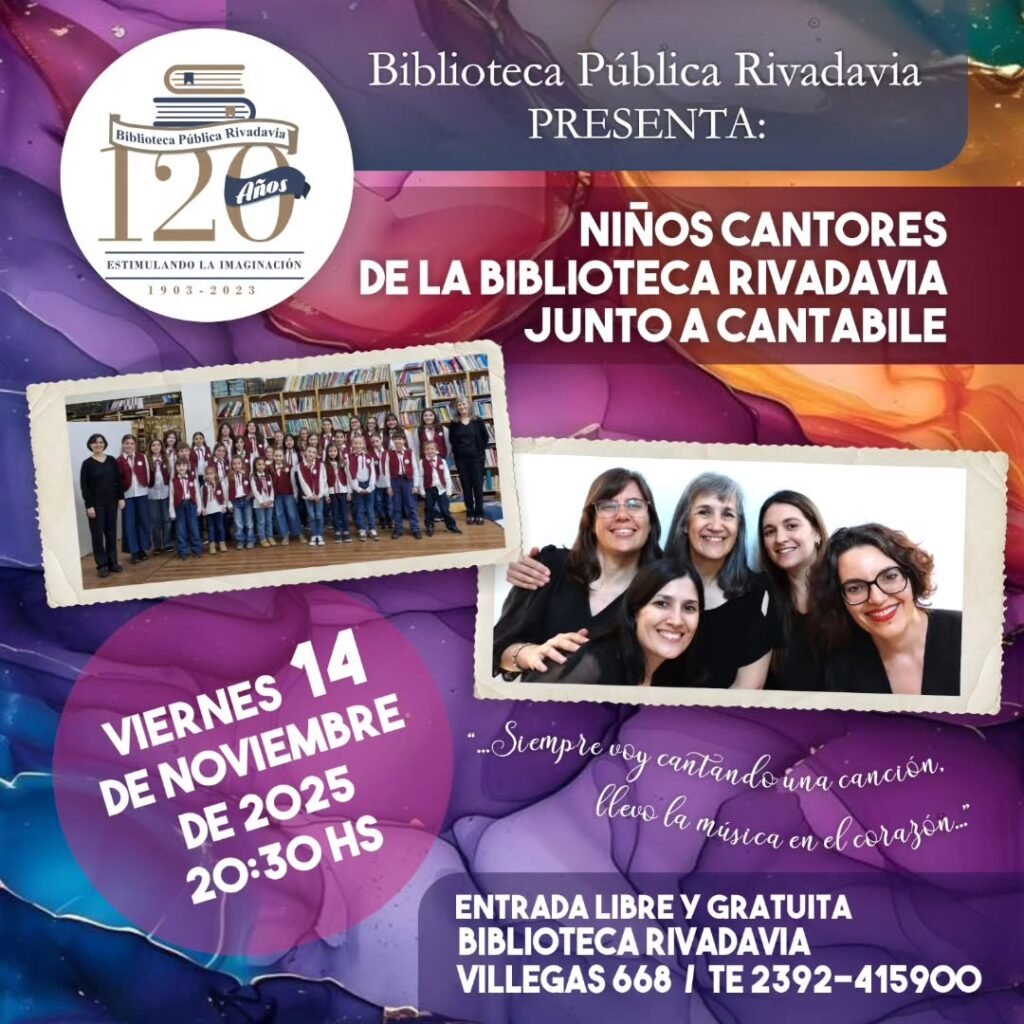 Este viernes 14 de noviembre a las 20.30 hs. Los Niños Cantores de la Biblioteca Rivadavia brindarán su último concierto del año junto a Cantabile, un grupo vocal femenino integrado por 5 ex- niñas cantoras. El concierto será en la Biblioteca Pública Rivadavia, con entrada libre y gratuita. Consultas al 415 900.