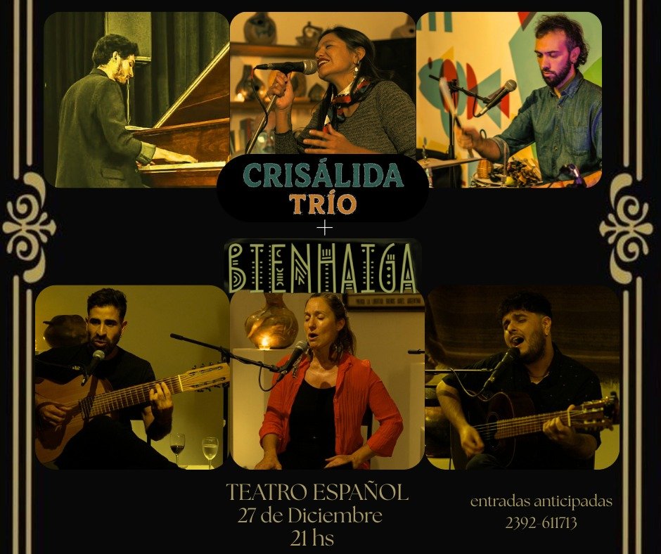 Este sábado 27 de Diciembre a las 21 hs en el Teatro Español de Trenque Lauquen se presentarán Crisálida Trío, con su viaje sonoro por el folclore argentino y latinoamericano, tejido entre voz, piano y percusión; y Bienhaiga, con su fuerza musical, sus hermosos arreglos vocales e instrumentales y esa calidez que los distingue.