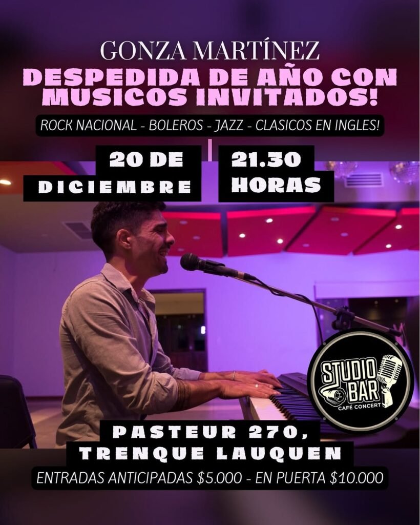 Este sábado 20 de diciembre Studio Bar (Pasteur 270) despide el año desde las 21.30 hs. con Gonzalo Martínez y músicos invitados. La propuesta musical incluye un repertorio de rock nacional, boleros, jazz y clásicos en inglés.