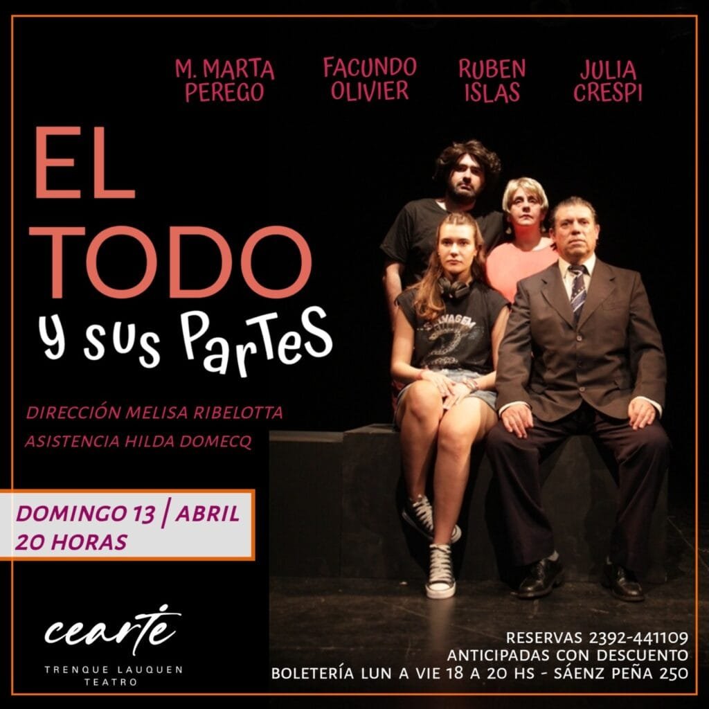 Este domingo 13 de abril a las 20 hs el Cearte vuelve a poner en escena “El todo y sus partes”, una obra de Beatriz Pustilnik, dirigida por Melisa Ribelotta, con las actuaciones de María Marta Perego, Julia Crespi, Ruben Islas y Facundo Olivier.