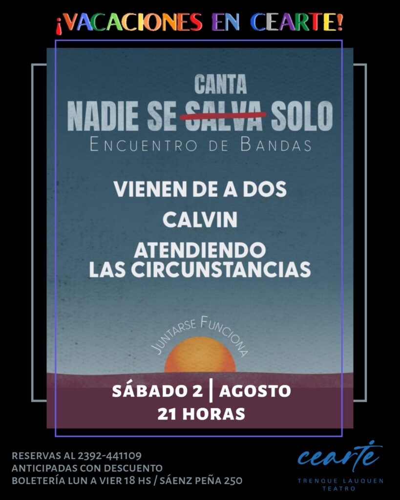 Este sábado 2 de agosto a las 21 hs. en el Cearte se realizará el encuentro de bandas “Nadie canta solo”, con la participación Calvin, Atendiendo las Circunstancias y Vienen de a Dos, en el marco del ciclo «Vacaciones en el Cearte».