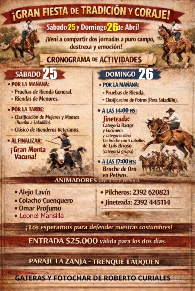 Este sábado 25 y domingo 26 de abril se realizará la Gran Fiesta de Tradición y Coraje en el Paraje La Zanja (Trenque Lauquen). El cronograma de actividades previstas es el siguiente: