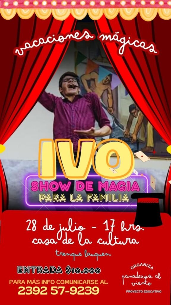 El lunes 28 de julio a las 17 hs. Ivo Redel presentará un show de magia para toda la familia en la Casa de la Historia y la Cultura, en una propuesta organizada por el Proyecto Educativo Panaderos al Viento.