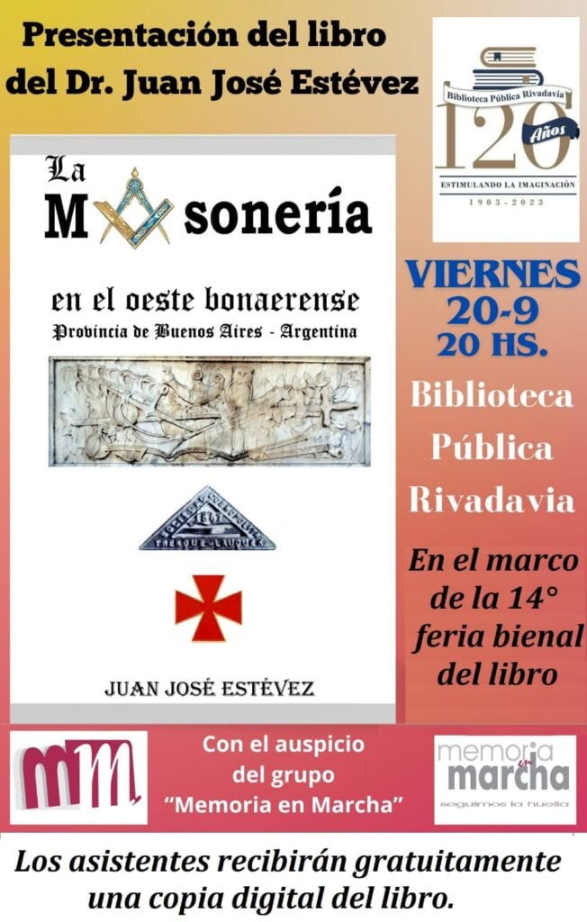 Es viernes 20 de septiembre a las 20 hs. el investigador de historia Juan José Estévez presentará en la Biblioteca Pública Rivadavia el libro “La Masonería en el Oeste Bonaerense”, en el marco de la 14ª Feria Bienal del Libro de Trenque Lauquen.