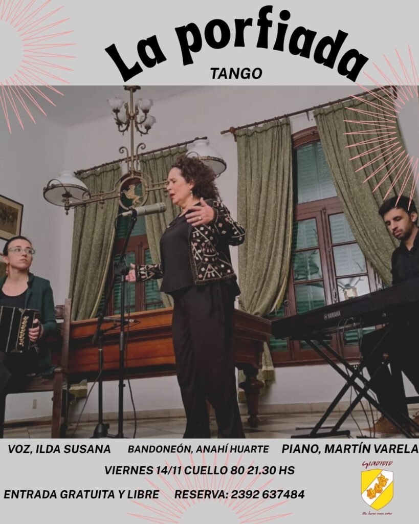 Este viernes 14 de noviembrea las 21.30 hs. en Café Gladiolo se presenta La Porfiada Tango, con entrada gratuita. Las reservas se pueden hacer al 2392 637484.