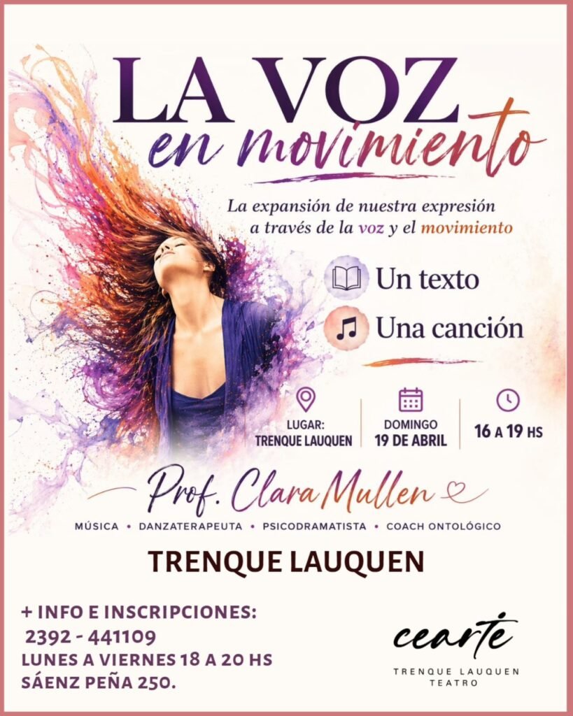 Este domingo 19 de abril de 16 a 19 hs en el Cearte la profesora Clara Mullen coordinará el taller “La voz en movimiento” en el Cearte (Sáenz Peña 250). Consultas e inscripción al 2392 441109.
