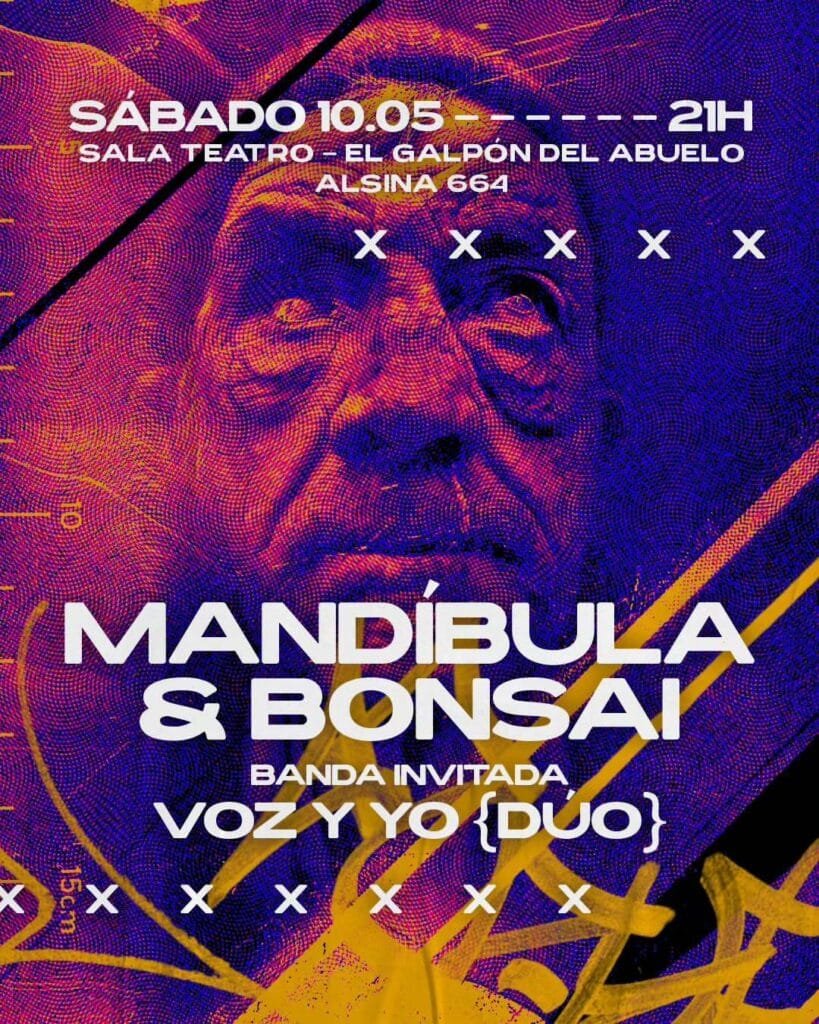 Este sábado 10 de mayo a las 21 hs en El Galpón del Abuelo (Alsina 664) se presentan las bandas Mandíbula y Bonsai, con el Dúo Voz y Yo como banda invitada.