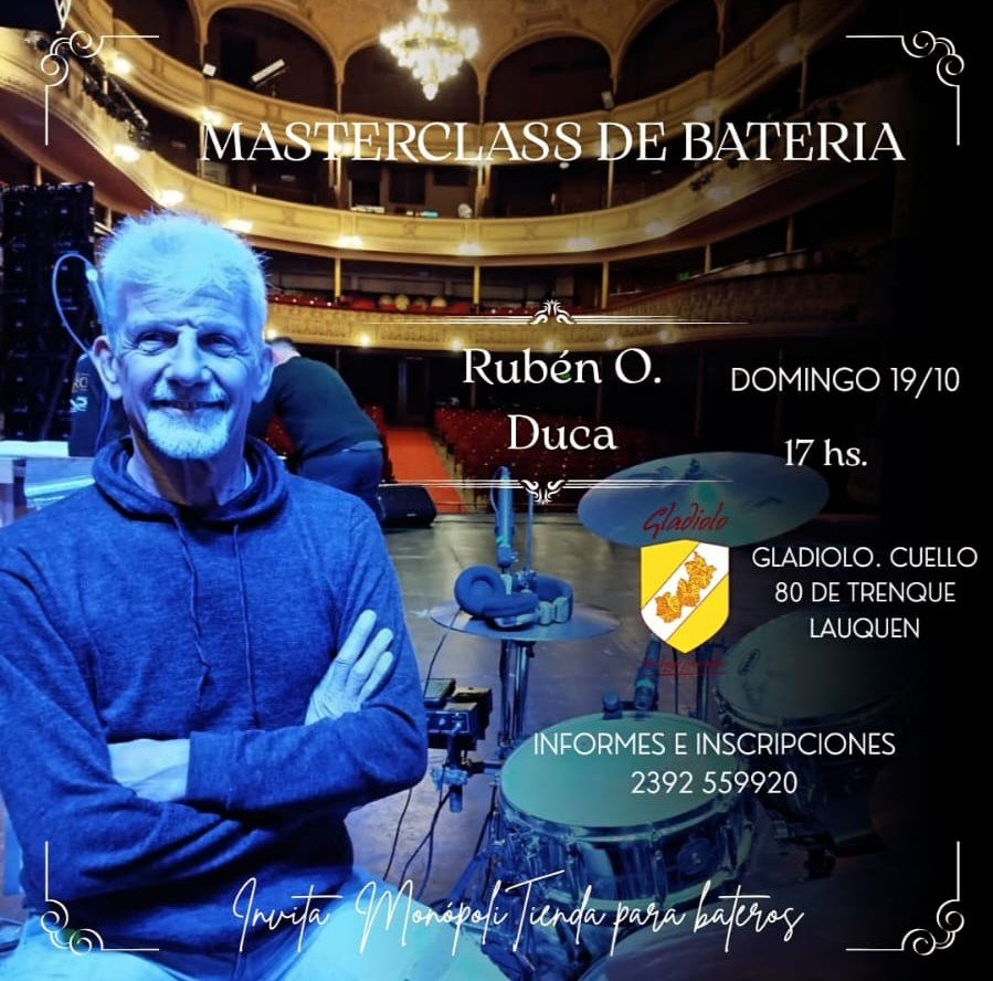 Este domingo 19 de octubre desde las 17 hs en Café Gladiolo se realizará una Masterclass de batería, a cargo del Maestro Rubén Duca, presentado por Monópoli tienda para bateros. Para informes e inscripción contactarse al 2392 559920.