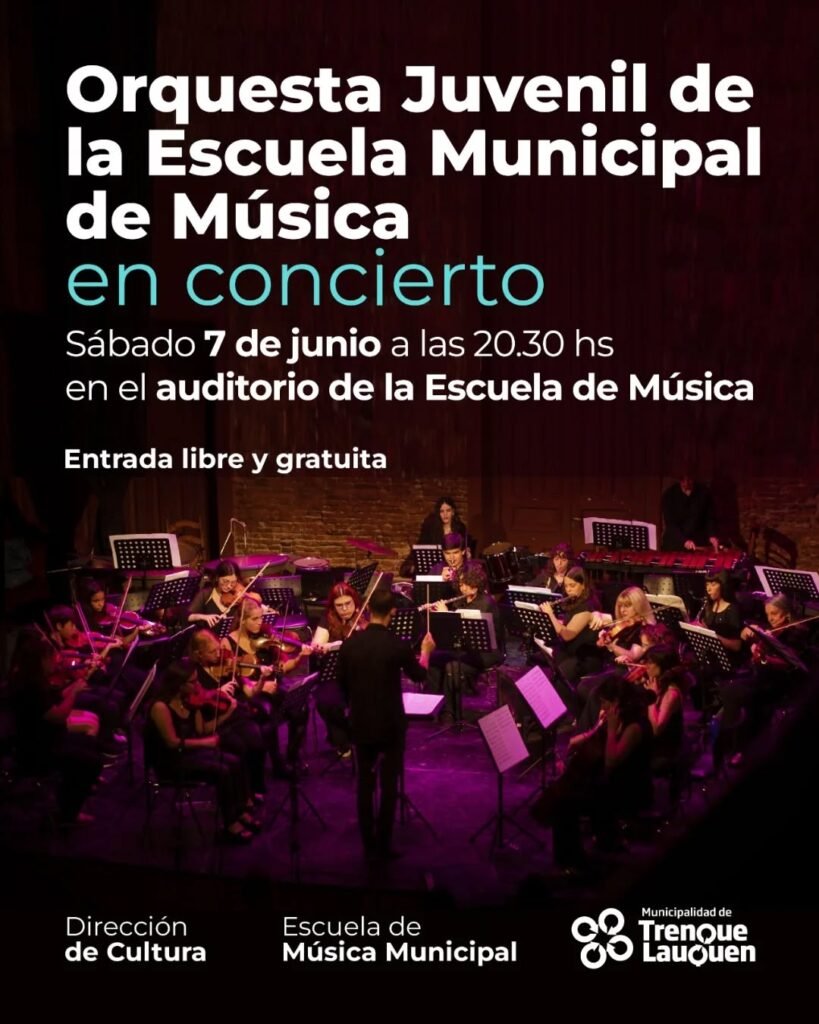 La Orquesta Juvenil de la Escuela Municipal de Música brindará un concierto el próximo sábado 7 de junio a partir de las 20.30 hs en el auditorio de la Escuela Municipal de Música, con entrada libre y gratuita.