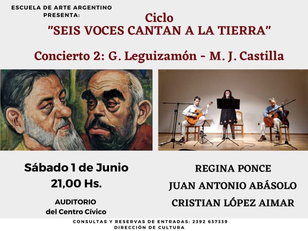 Una nueva velada en el marco del ciclo “Seis voces le cantan a la tierra” se dará este sábado 1° de junio a las 21 hs. en el Auditorio del Centro Cívico, presentado por la Escuela de Arte Argentino.