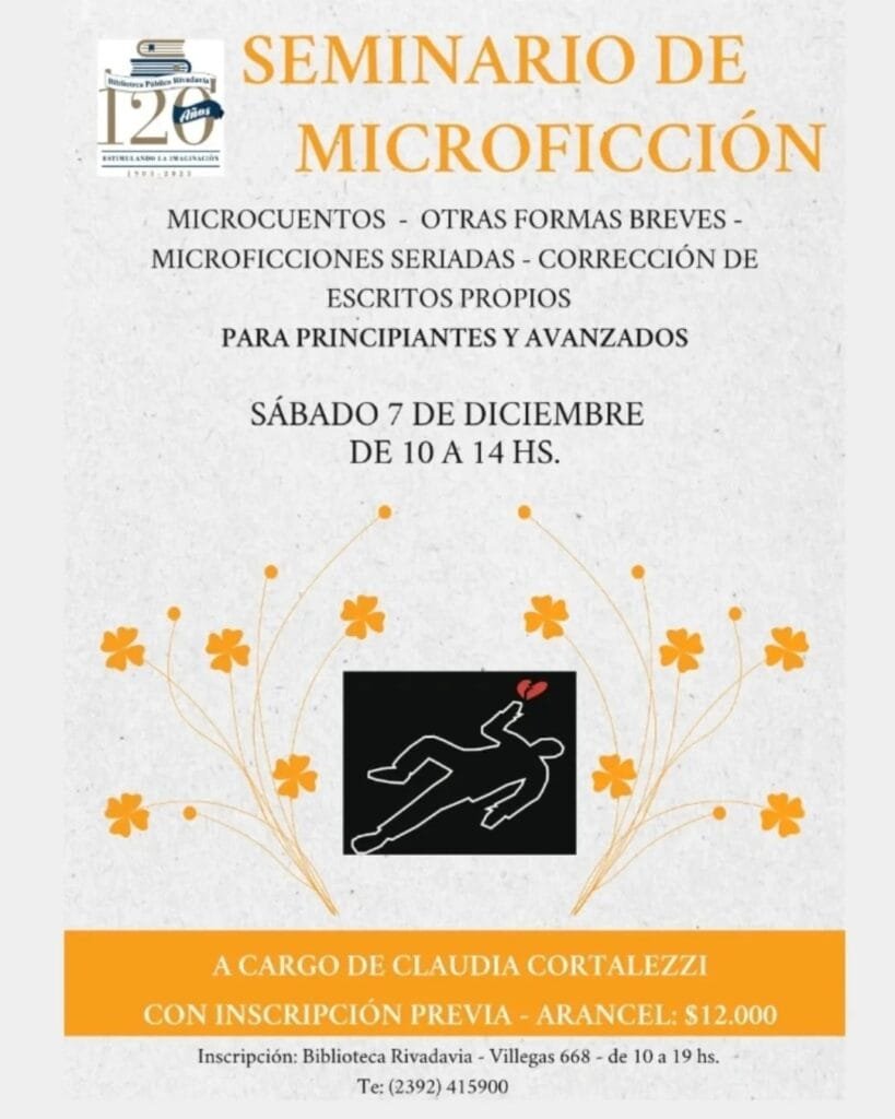 Con la dirección de Claudia Cortalezzi, escritora local de vasta trayectoria como editora, antóloga, correctora y coordinadora de talleres de escritura, la Biblioteca Rivadavia propone un Seminario de microficción que se realizará el sábado 7 de diciembre de 10 a 14 hs., dirigido a escritores avanzados y principiantes.