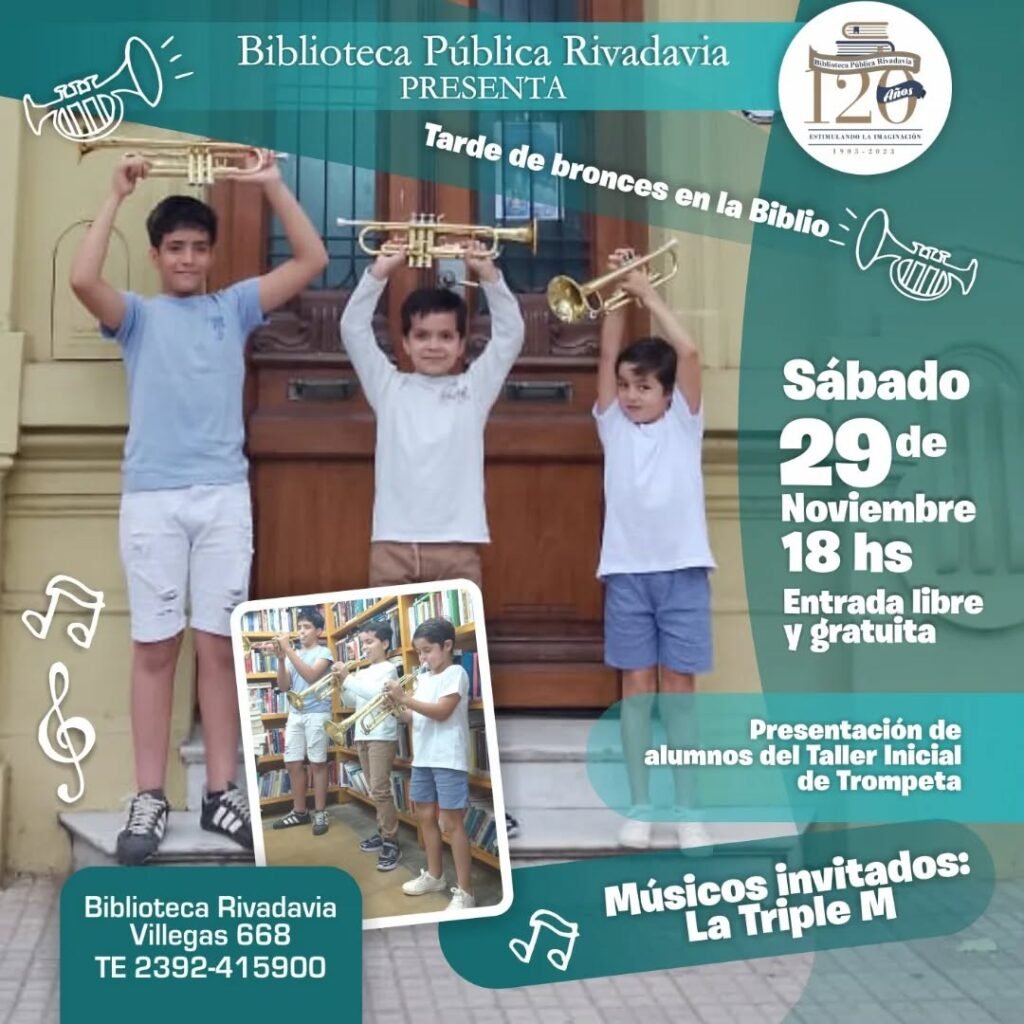 Este sábado 29 de noviembre a las 18 hs. en la Biblioteca Rivadavia se realizará una “Tarde de bronces en la Biblio”, con la presentación de alumnos del Taller inicial de Trompeta. Además como músicos invitados estará “La Triple M”.