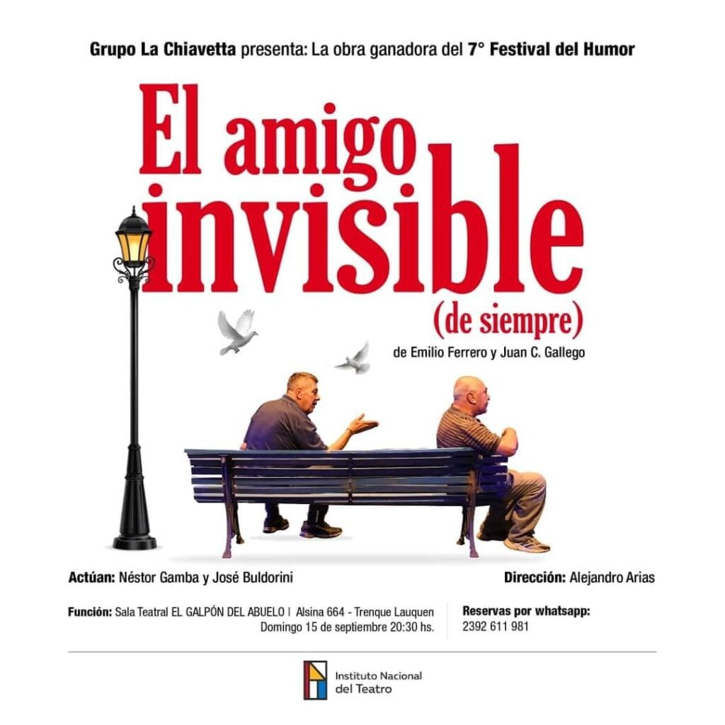 Este domingo 15 de septiembre a las 20.30 hs se presentará en El Galpón del Abuelo (Alsina 664) la obra teatral El amigo invisible (de siempre), de Emilio Ferrero y Juan C. Gallego.