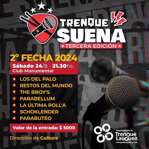 La segunda fecha del Festival Trenque Suena 2024, el encuentro que convoca a bandas y agrupaciones locales, tendrá lugar este sábado 24 de agosto a partir de las 21.30 en instalaciones del Club Monumental (Castelli nº 716). En esta oportunidad subirán al escenario Los del Palo, Restos del Mundo, The Bboy’s, Parabellum, La Última Roll’a, Schoklender y Parabuteo.