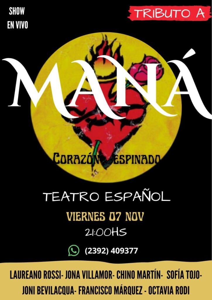 El próximo viernes 7 de noviembre a las 21 hs. se presentará en el Teatro Español un Tributo a Maná “Corazón Espinado”, integrado por los músicos Laureano Rossi, Jona Villamor, Chino Martín, Sofía Tojo, Joni Bevilacqua, Francisco Márquez y Octavia Rodi.