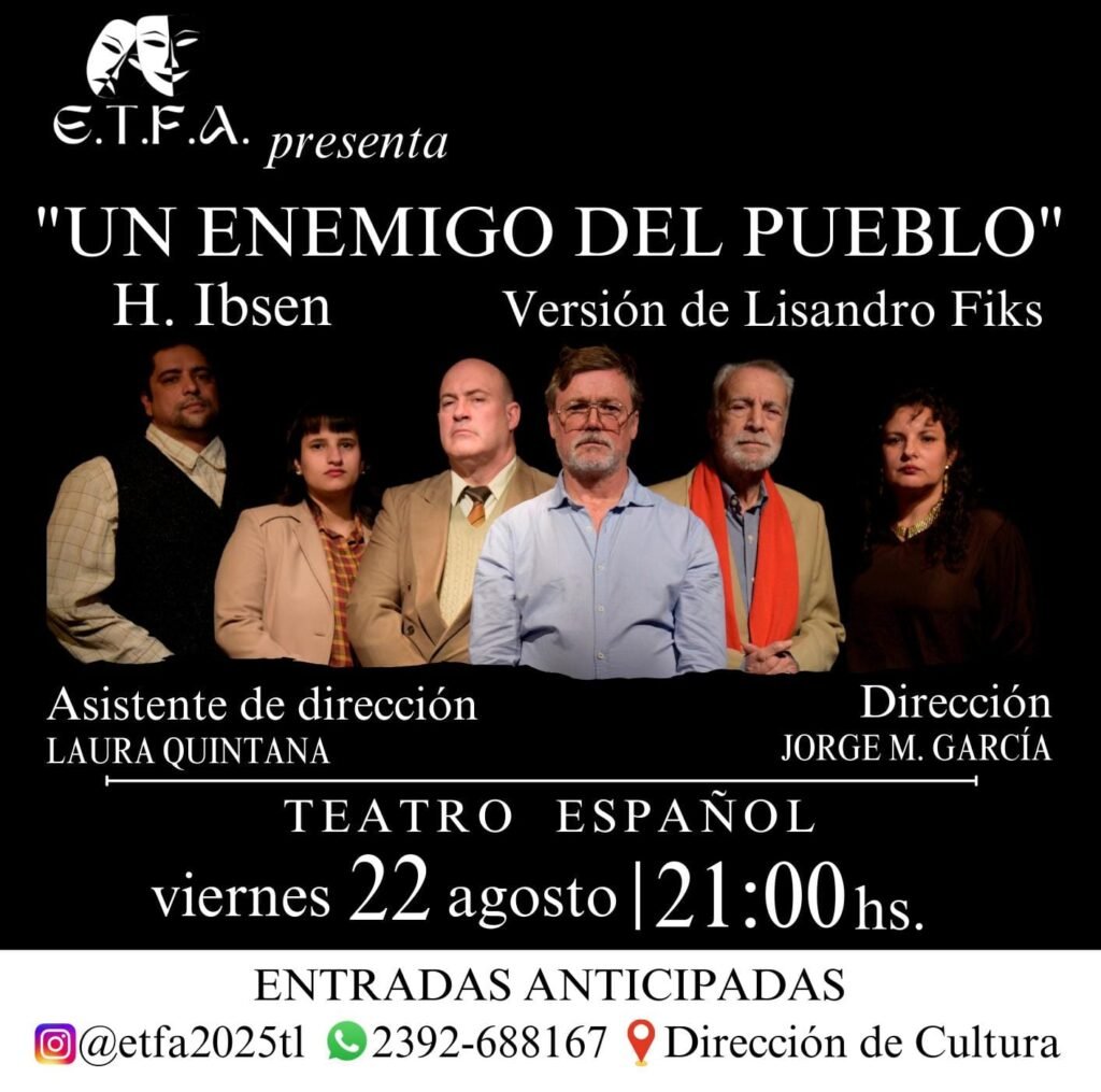 El Espacio Teatral para la Formación de Actores (ETFA) vuelve a presentar este viernes 22 de agosto a las 21 hs. en el Teatro Español la obra “Un enemigo del Pueblo” (versión de Lisandro Fiks), escrita por Henrik Ibsen en 1882, en el cual este “librepensador” de finales del siglo XIX se cuestionaba asuntos que aún hoy siguen siendo controversiales.