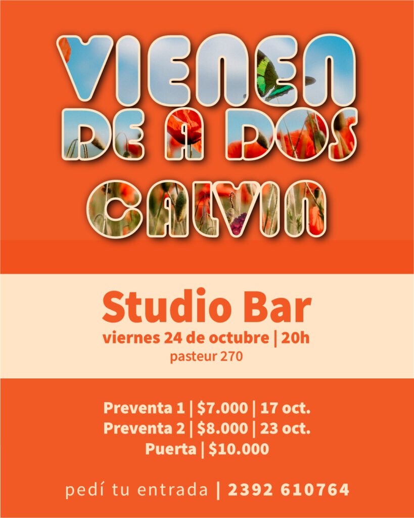 Este viernes 24 de octubre a partir de las 20 hs. en Studio Bar se presentarán nuevamente en concierto el dúo “Vienen de a Dos” y la banda “Calvin”, integrada por jóvenes músicos de entre 11 y 18 años.