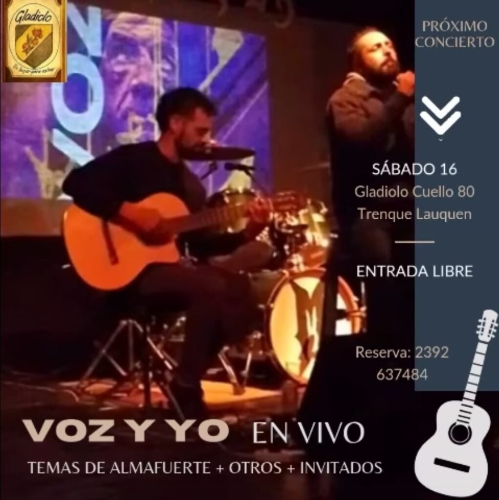Este sábado 16 de agosto desde las 21.30 hs. en Café Gladiolo se presenta “Voz y Yo”, dúo conformado por Martín Servera y Federico Arrieta, presentando temas de Almafuerte con músicos invitados.